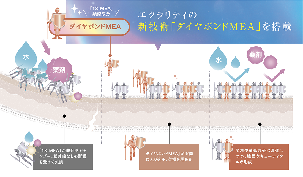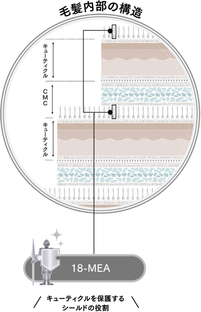 髪本来のツヤの素になる「18-MEA」はキューティクルの最表層と何層にも重なっているキューティクル間に存在し、キューティクルを保護するシールドのような役割を果たしています。「18-MEA」はカラーやブリーチなどの薬剤の他、水分や紫外線によって消失し、キューティクルの剥がれ・めくれを引き起こすことも。そこで、減ってしまった「18-MEA」に類似の成分「ダイヤボンドMEA」がアプローチすることで薬剤にも水にも負けないシールドを強化。カラー剤の脱色・脱染を邪魔することなく内部補修成分を抱え込み、キューティクルが傷つきにくい状態へと導きます。
