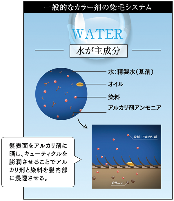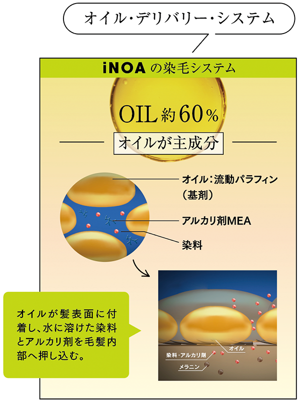 イノアカラーはロレアル独自の染毛テクノロジー“オイルデリバリーシステム”を採用しています。一般のカラー剤※2が髪表面をアルカリ剤にさらしキューティクルを膨潤させることでアルカリ剤と染料を髪内部に浸透させるのに対して、イノアは水がオイルから逃げ出そうとする反発力を利用。キューティクルを膨潤させることなく、アルカリ剤と染料が効率良く浸透します。