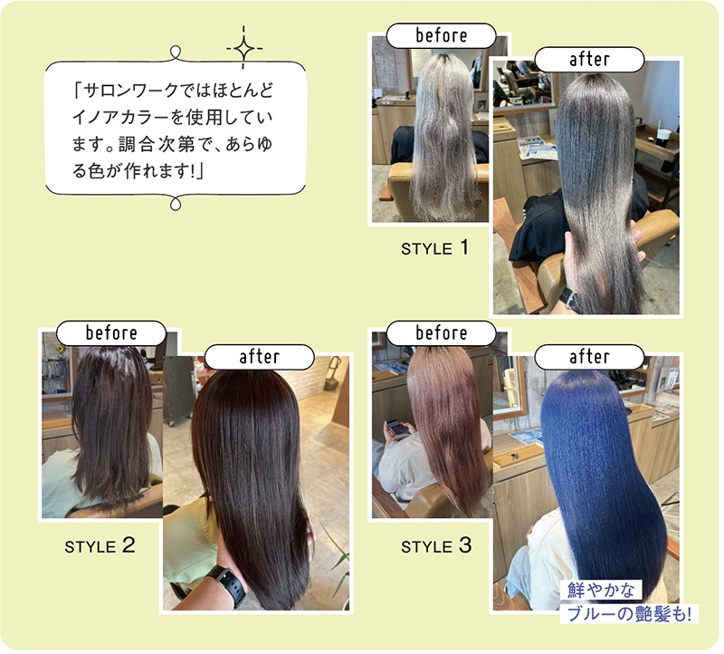 クラン バイ ナチュラルでは、くせ毛や白髪のお悩みに寄り添う“髪の病院”をコンセプトに掲げています。このため20代30代の女性を中心に、お客様の7割が髪質改善ストレートを希望されます。昨年7月にオープンしてSNSで髪質改善をキーワードに集客する中で、髪質改善と相性の良いカラー剤を探していました。臨店講習でイノアカラーを使ってみたところ、ドライで塗布しても伸びがよく、ミックスすることで幅広い色みを表現できる点が気に入りました。一般的にイノアカラーは中低明度のイメージがありますが、鮮やかなカラーや、ブリーチ、バレイヤージュにもイノアカラーを使うことでオリジナリティのあるデザインを打ち出せると考え、導入を決めました。髪質改善をウリにすることで元々高かった単価をさらにアップできるとも思いました。