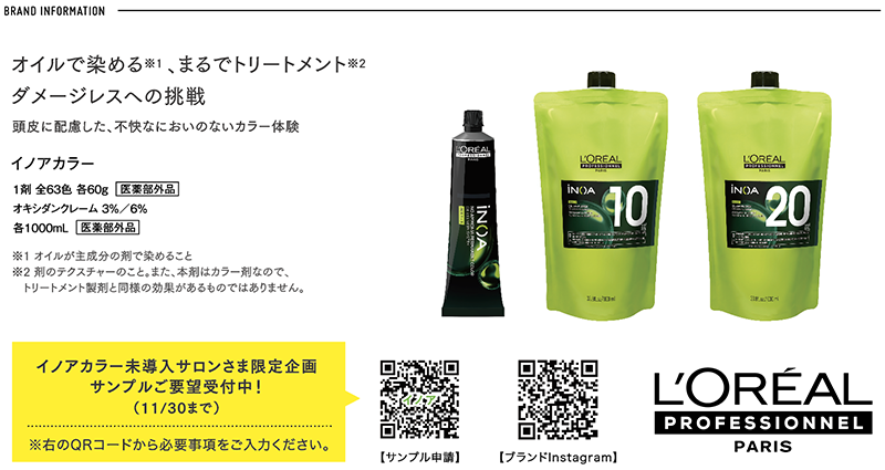イノアカラーはオイルを主成分をすることで、カラーによるダメージに配慮してツヤやかな仕上がりを叶えるプレミアムなカラー剤です。加えてアンモニア無配合でありカラー剤特有の刺激臭がなく、頭皮にも配慮。ワンランク上のカラー体験を提供できるとあって注目が高まっています。