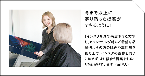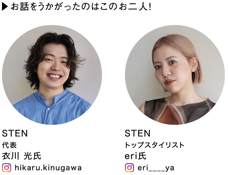 自立する女性を応援し、ライフスタイルをサポートするというコンセプトを掲げ、25〜30台前半の女性のお客様から高い支持を得ているSTEN。ブリーチオンカラーのオーダーが多いそうですが、派手髪ではなく彩度を抑えた上品なハイトーンを提案するSTENの衣川さんとeriさんに、今回の新色の使いこなしを伺いました。