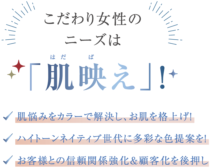 eriさん 「ロイヤルヴェールは単品でも色ブレせず肌映えするきれいな色が出せますし、明度に合わせてトーンを変えることもできるので、お客様のご希望に合わせやすいです。ピンクパープルのオーダーも多いのですが、ピンク寄りにするかパープル寄りにするかで迷っているときにピンクパールが最適。彩度は控えめにしつつどちらの色味も感じられますし、発色がきれいなのでお客様に喜ばれています」