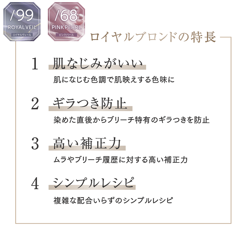 派手髪を楽しんだ女性は、さらに“今の自分”に合った提案をしてくれるマイスタイリストを探しています。ハイトーンを楽しむだけでなく、肌も美しく見せる+αの付加価値まで提案できるロイヤルブロンド。肌も格上げするロイヤルブロンドは、肌映えハイトーンカラーです。