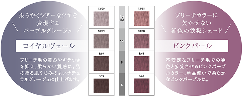 衣川さん 「今回の新色は日本人の肌色との相性がよく、くすみのない白肌に見えやすいと感じました。30歳前後で初めてハイトーンに挑戦されるお客様も多く、そういう方は彩度が強すぎると不安になりがちですが、新色はそこまで強すぎないのでほどよい色表現ができますし、アジア人の髪の赤みに対して、絶妙に相性がいいです。また彩度が強すぎるとブリーチベースをきれいに整えないとムラになりますが、それもないので重宝しています。