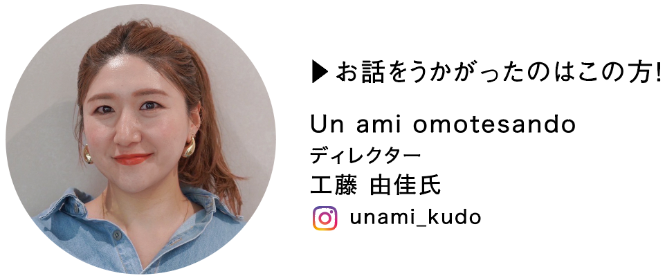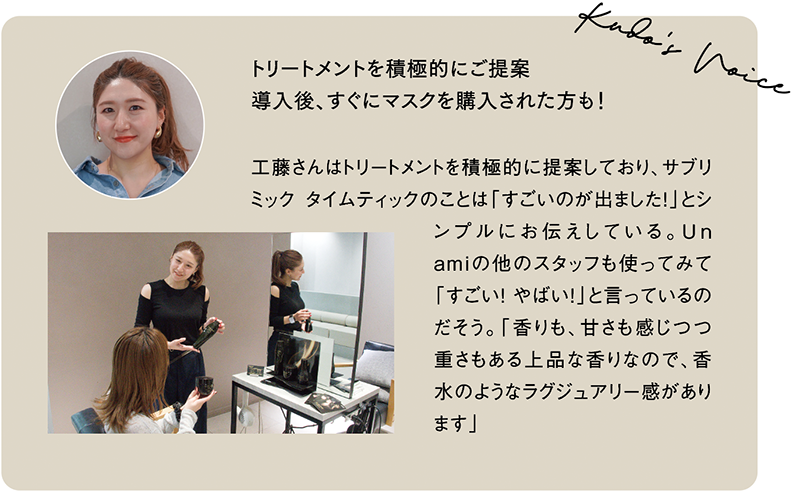 トレンドを取り入れつつナチュラルテイストが人気のUn ami。中でも表参道店はトリートメント比率が高く、お客様のケア意識が高いのだそう。以前からサブリミックが大人気という表参道店、ディレクターの工藤 由佳さんに、サブリミック タイムティックの反響と魅力を聞きました。