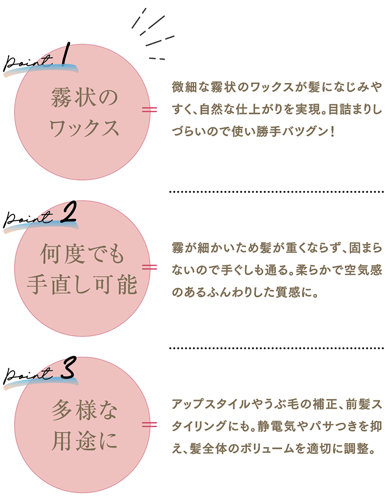 ワックスはどうしても手がベタついたり、均等に塗布するのが難しかったりして、苦手意識を持っている方が多いのですが、ワックス スプレーはワックスとスプレーの中間のような剤形。霧状にワックスが噴射されるのでまんべんなくスプレーできますし、手もベタつきません。軽やかでエアリーな質感を出せるので人気の韓国風レイヤースタイルにも最適ですし、固めるスプレーと違ってスタイリング後に手ぐしを通すこともできるので、自由自在にフォルムを整えられます。