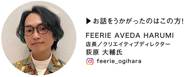 東京・晴海の新興住宅街に位置するFEERIE AVEDA HARUMIは、30〜40代のファミリー層が顧客の中心。店長の荻原 大輔さんは「おしゃれ感があり、流行もほどよく取り入れながら上質な美しさを求めるお客様が多いですね」と語ります。今回は荻原さんにワックス スプレーが今、改めて見直されている理由や、上手な使いこなし方を伺いました。