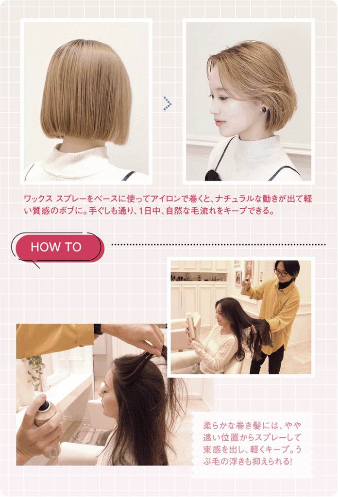 ウェット系やオイル系のスタイリング剤が市場に数多く出回る中、ワックス スプレーが今、新たな潮流を生み出しています。従来のワックスとスプレーの特性を融合したワックス スプレーは多様なスタイルに対応できる万能性と扱いやすさ、時短が魅力。ヘアデザインを自在に操るワックス スプレーは要注目です。